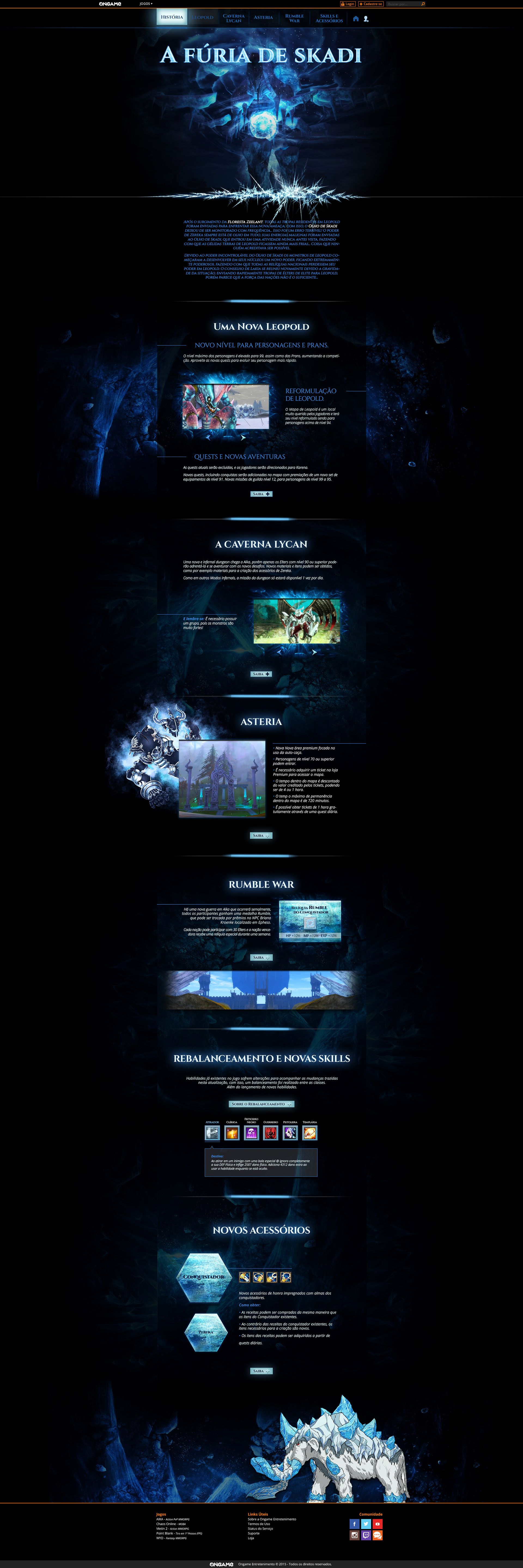 Complete landing page for Fury of Skadi from the game Aika, designed to showcase the story, characters, and challenges of the new game phase, engaging players and highlighting special rewards and mechanics.